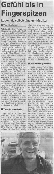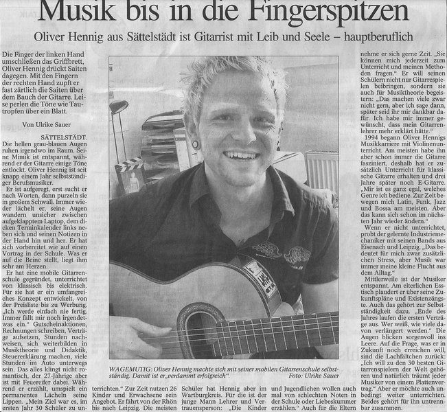 OLIVER HENNIG der Berufsmusiker und Künstler ist ein echter GUITAR NEWCOMER aus dem Thüringischen Wartburgkreis. Der Vollblutmusiker, der in seinem Leben keine schönere Ablenkung findet als die Musik, gehört zu den meist gesuchten und gefragten Gitarristen/ Musiklehrern seiner Gegend. Er ist dort der jüngste der Branche.