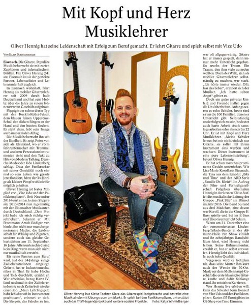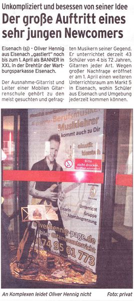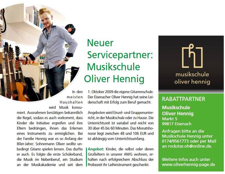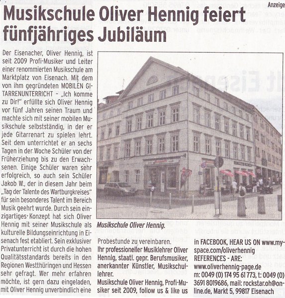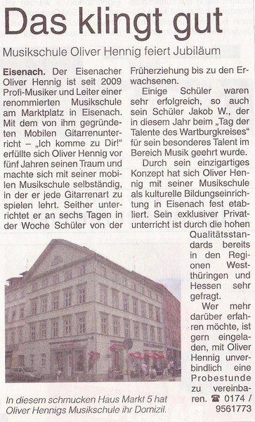 Die MUSIKSCHULE OLIVER HENNIG – der MOBILE GITARRENUNTERRICHT hat sich im Jahr 2014 zu einer kulturellen Bildungseinrichtung und renommierten Musikschule in Eisenach fest etabliert. Es wird an sechs Tagen in der Woche unterrichtet, Schüler von der Früherziehung bis zu den Erwachsenen – jede Gitarrenart. Das einzigartige Konzept, was es so kein zweites Mal gibt, ist bereits in den Regionen Westthüringen und Hessen sehr gefragt. Es folgte 2015 eine Einladung vom sehr erfolgreichen Buchautor, Komponisten und Gitarrenlehrer BERND KILTZ aus Frankfurt, der die MUSIKSCHULE OLIVER HENNIG auf persönlicher Anfrage unter PREMIUMGITARRENLEHER.de fest verankerte. Es stehen insgesamt mit der MUSIKSCHULE OLIVER HENNIG drei private Gitarrenlehrer (Musikschulen), unter dem Bundesland Thüringen!