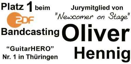 OLIVER HENNIG erzielte den ersten Platz beim Bandcasting vom ZDF von 18 Gitarristen, engagierte sich für junge Bands und war Jurymitglied von "NEWCOMER ON STAGE". Er bildete sich pädagogisch und didaktisch weiter, indem er zahlreiche Seminare und Workshops an Musikschulen in ganz Deutschland besuchte, u.a. die MUSIC ACADEMY HAMBURG, wo die Kinder des legendären POP-TITAN DIETER BOHLEN regelmäßig gastieren. Bis in die Gegenwart gibt er erfolgreich Privatunterricht sowie Unterricht an verschiedenen Schulen.