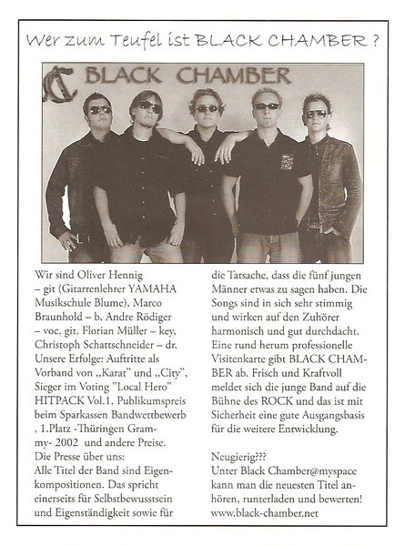 "BLACK CHAMBER" holte u.a. 2003 den THÜRINGEN-GRAMMY AWARD, veröffentlichte 2004 die erste MAXI CD ''TIME TO TAKE'', war Sieger u.a. im Voting "Local Hero" auf der HITPACK CD VOL.1 – diese war überall im Handel erhältlich und standen mit dem Deutschrock legenden "CITY" und "KARAT" auf einer Bühne. Bis zum Angebot von einem Plattenlabel schafften sie den Traum aller Musiker und Künstler.